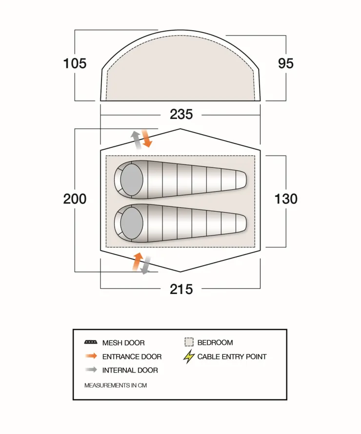 The double door, double porch design offers plenty of space for 2 people plus gear storage or as a sheltered cooking zone, whilst the pre-bent poles increase head height to offer a more liveable internal volume.