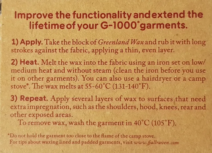 The Fjallraven Greenland Wax is an environmentally friendly wax impregnation for clothes made of G-1000 fabric. Gives a water-resistant and hard-wearing surface. Made from paraffin and bee wax.