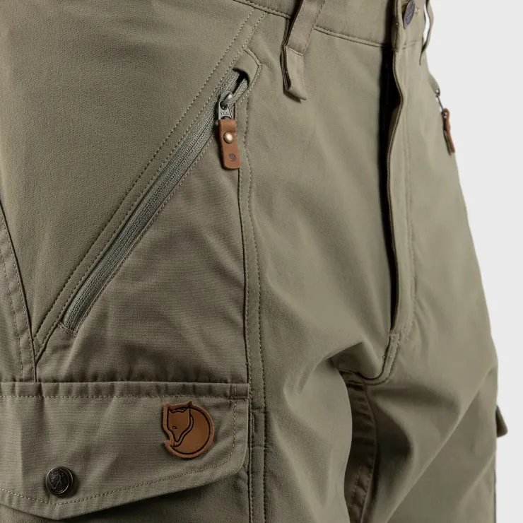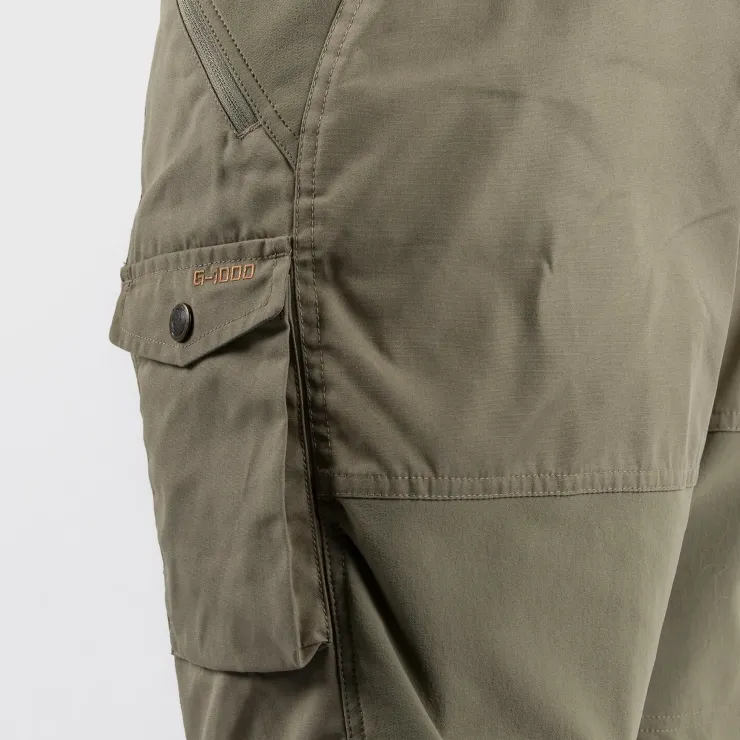 The waist is a bit lower in the front and higher in the back to sit comfortably when carrying a backpack. An extra piece of fabric in the crotch and the placement of the in-seams decrease the risk for rubbing. The zippered hand pockets are placed for easy access even when wearing a hip belt. Large leg pocket with flap and a smaller mesh inner pocket on the right leg, a small pocket for a mobile telephone or GPS on the left leg. Stretch in the lower back and G-1000 reinforcement in the rear.