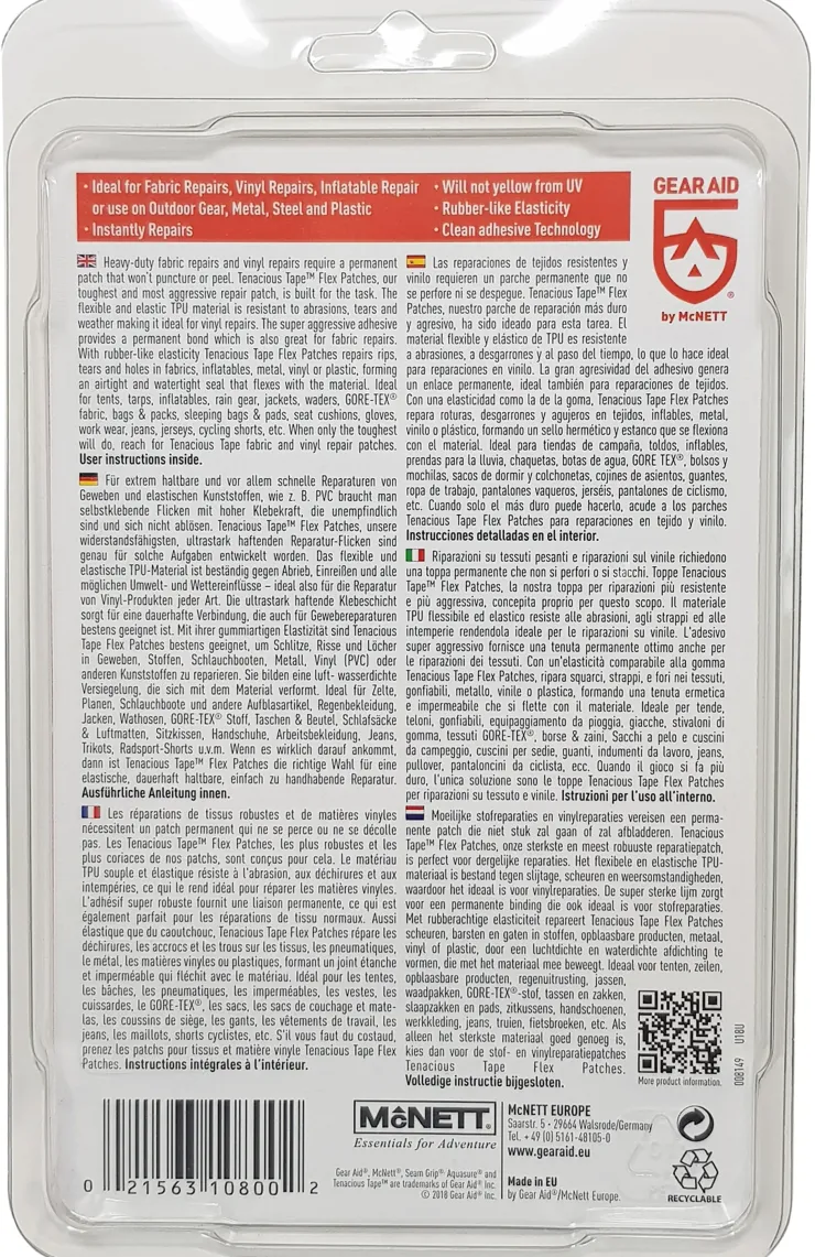 - Stretches – Incredible elasticity for repairs that flex with fabric; includes two 3”x5” patches