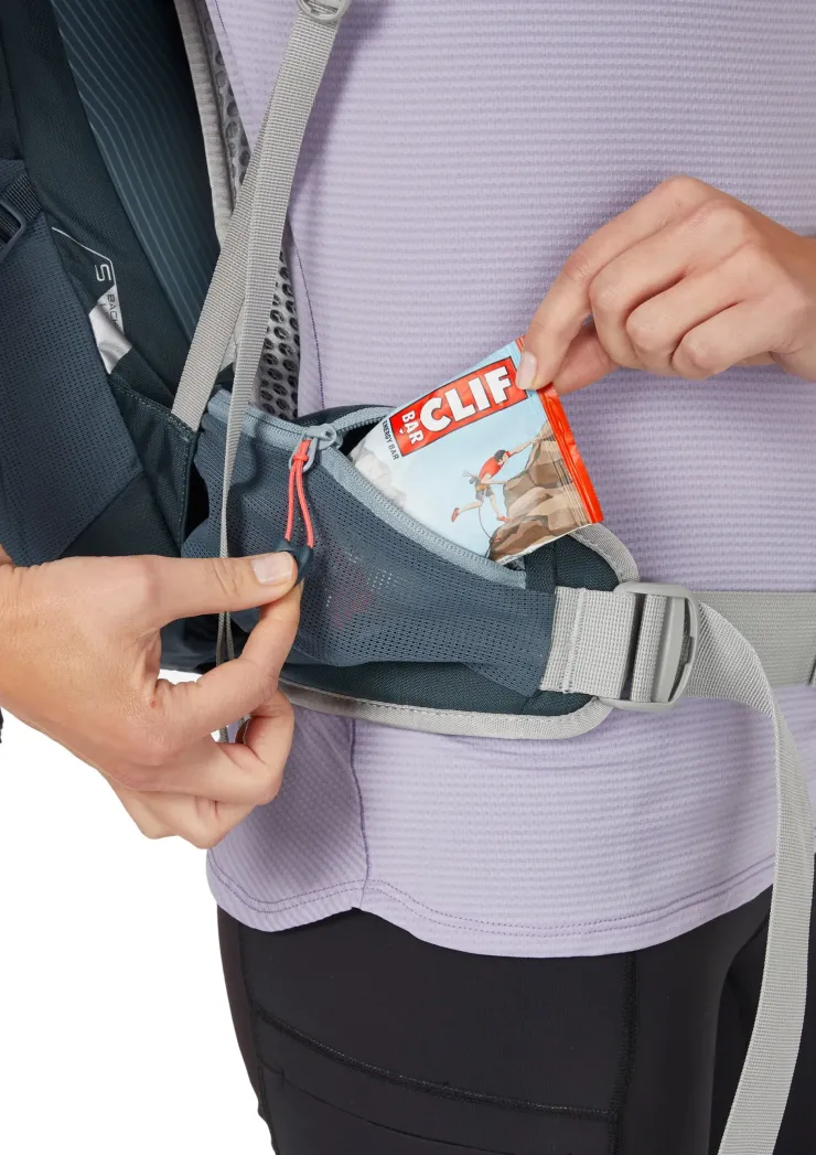 The backpack features a forward pull hipbelt system so you can easily adjust the fit, and a rain cover in case you get caught out in a storm. Compatible with a 3L water bladder and flanked with stretch mesh water bottle side pockets, the pack makes it easy to stay hydrated and fuelled, with zipped hipbelt pockets ideal for stashing snacks. There’s plenty of space for your gear in the expandable side pockets, zipped lid pocket and a front stash pocket perfect for stowing an extra layer. Walking poles can be attached using the handy bungee retention system.
