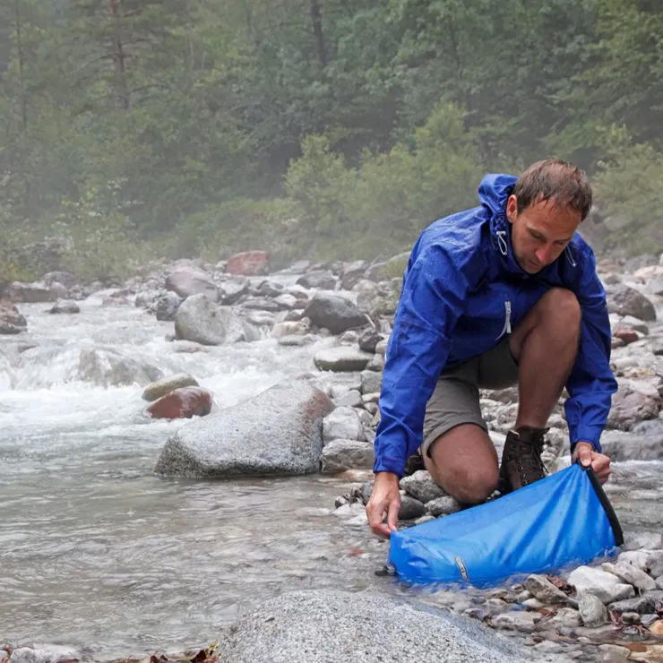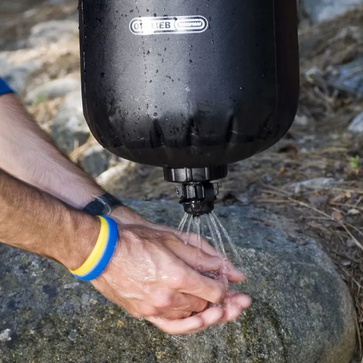 On tour the Water Sack can be packed away taking up very little space, in the camp it offers a generous 10 litres for cooking, washing or even for a shower. The large roll-closure opening allows easy filling, and it’s made of tear-resistant, waterproof fabric, with a integrated base valve for easy metering.