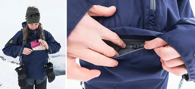 - Inner ‘dry’, zipped pocket for storage and hand-warming – also fits an OS map