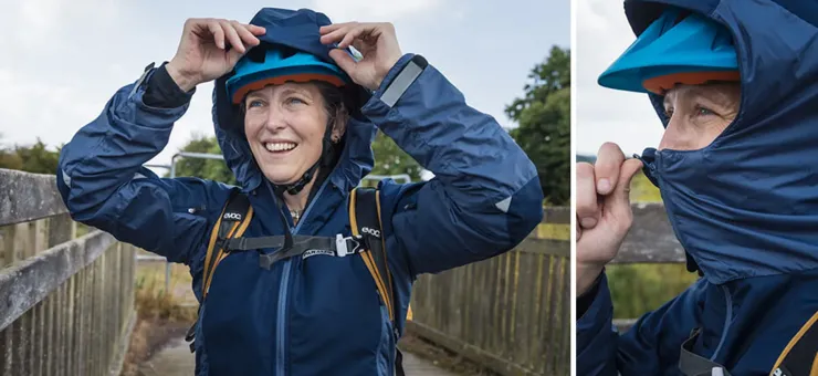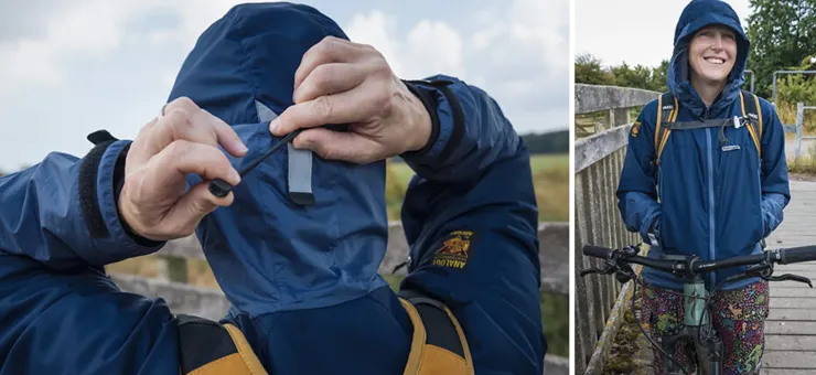 - The hood can be rolled away securely using a hook and loop tab on the rear of the hood and passing it through the hanging loop of the jacket.