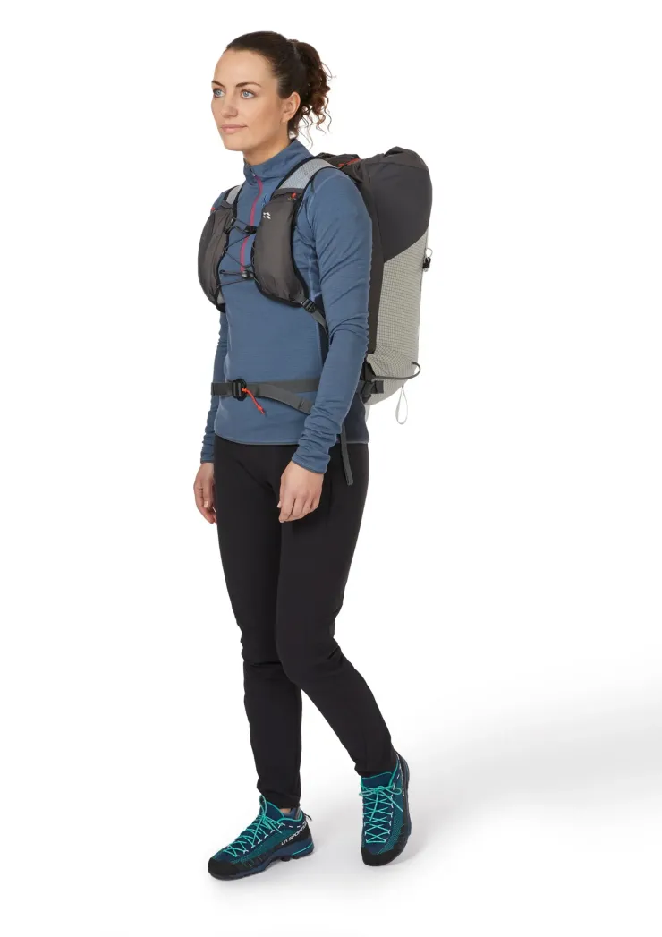 The secure, body-hugging chest harness is fully adjustable and constructed usingMono Mesh, which is 50% lighter and retains 70% less water than alternatives, keeping you well ventilated and spreading the load across your back for a comfortable fit. Featuring a snow-shedding back panel to keep the pack light and two ice axe loops with bungee retention, the pack is adapted for any challenge you might face during the ascent. Access the pack using the top drawcord, with a weather flap seal to protect your kit from the elements. The webbing waist belt has a quick release buckle and can be removed to shed more weight. You’ll find multiple storage options such as gear attachment points, a zipped rear pocket, internal security pocket for valuables and harness pockets for on-the-go access to your topo, phone or snacks.