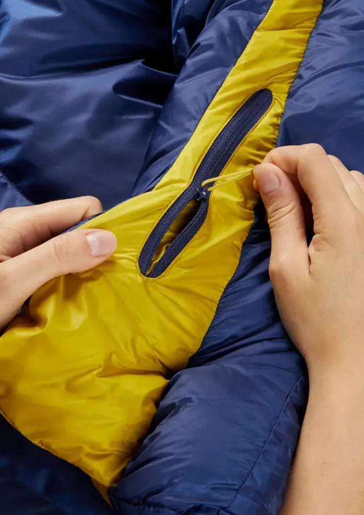 For the alpinist looking for a lightweight, low bulk sleeping bag suited to high altitude camps, the Neutrino offers exceptional warmth for low weight. Built for big mountain bivis, hut to hut stopovers, or multiple nights at basecamp, this sleeping bag is light in your pack and light on the planet, filled with ultra-high lofting down and made with recycled fabrics.Materials