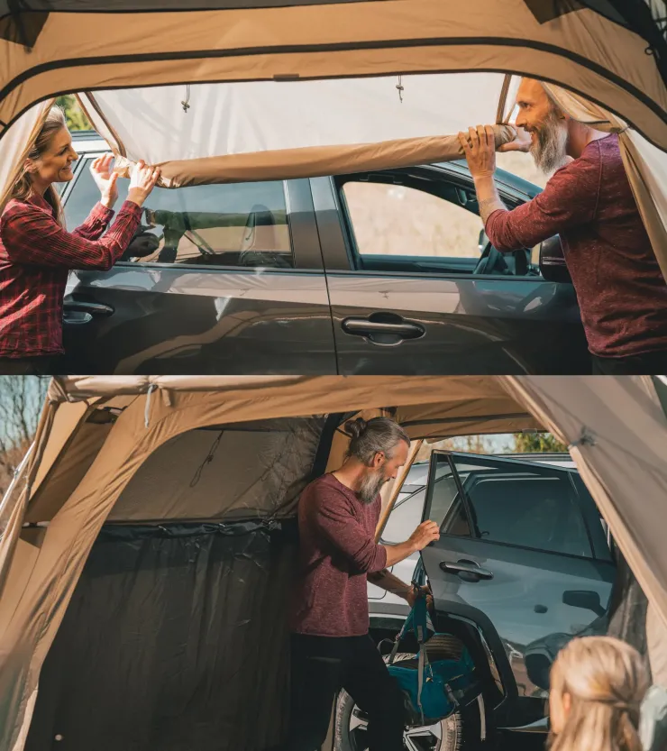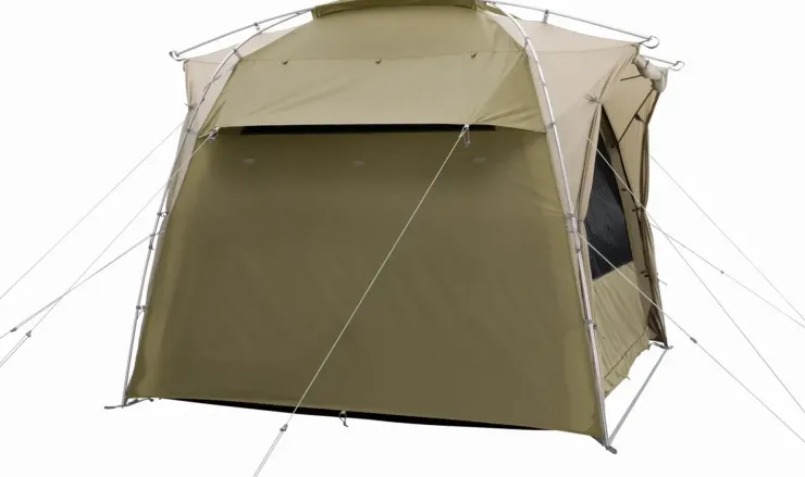 Symmetrical front and back doors provide variable access in and out of the tent, complete with rain safe canopies to allow you to enter and exit the tent in poor weather. These doors can be rolled up and tucked away to create a open shelter, or excellent through-breeze when hot. The main front door can be poled out using optional extra poles (not included) to create a canopy, extending the tent’s living area. This door can also be extended to your vehicle, creating a sheltered awning during short trips, or providing sheltered access to your car.