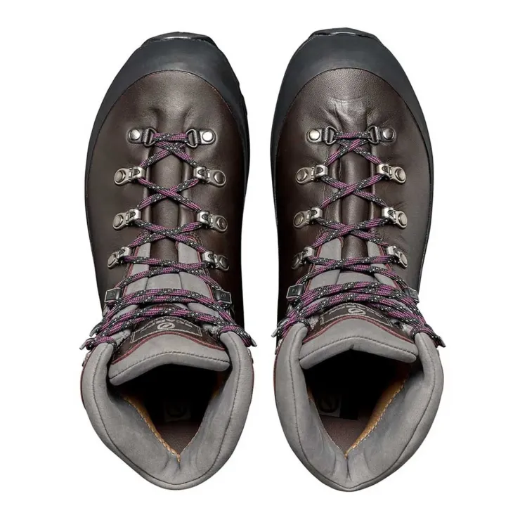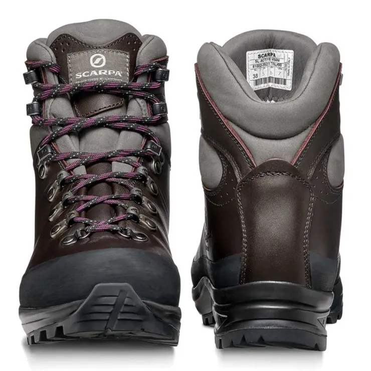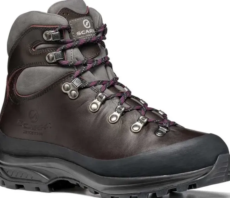Specifically built around the women’s TML last shape, the SL has an improved heel fit and a softer nubuck leather cuff with cut out at the Achilles for comfortable long descents in the mountains. The new speed lacing system gives a sure hold across the instep, and the leather lining inside the boot is instantly luxurious and comfortable. The SL is built using a 2.8mm Sherpa leather (the toughest and most water resistant of any full grain leather Scarpa uses) impregnated with HS12 and build as a one-piece construction for durable weather protection. The SL also uses the Vibram biometric trek sole for traction and support when carrying a large pack. The leather and 37.5 Cocona lining (and lack of membrane) make this a brilliant boot for warm weather trekking as well.