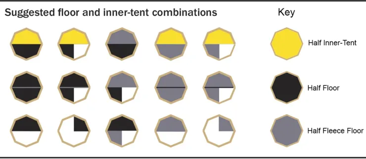 The half floor offer versatile living as they can be used in conjunction with the Half-Inner Tent, the Half Fleece Floor, or on its own. This allows you to create separate sections inside your tipi, and they can easily be attached and detached by Velcro. Please see images for suggest combinations.