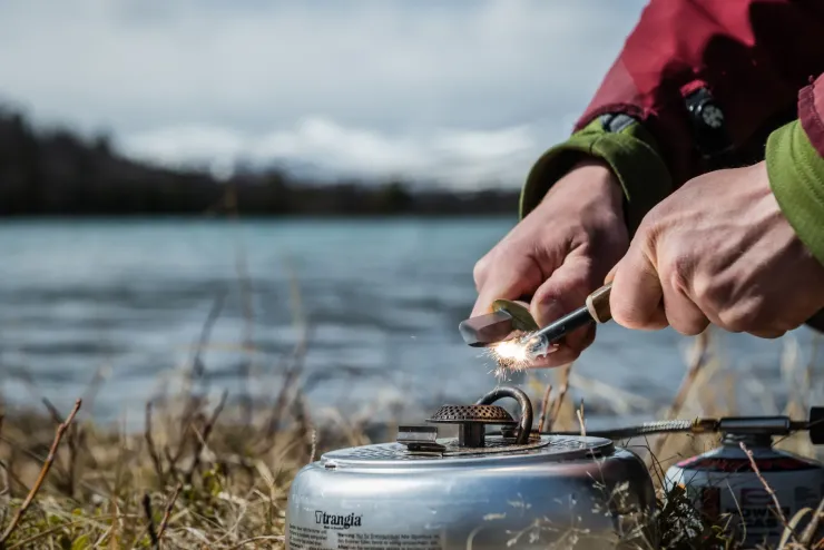 A small, compact stove that takes up minimal room in the rucksack. Here too, large billies can be placed on the raised supports in the upper windshield.