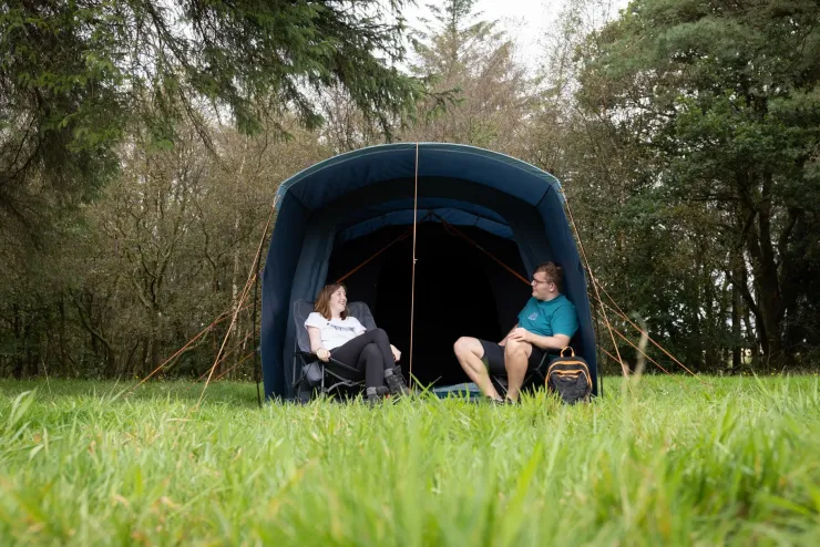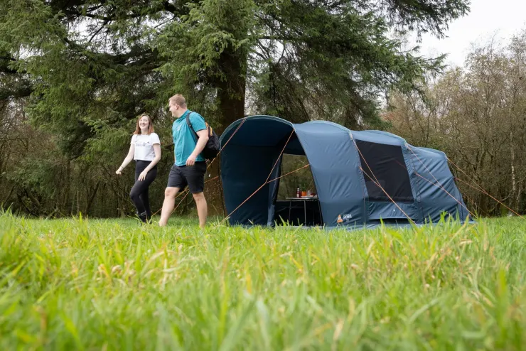 The front door with two large mesh panels can be rolled to the side to fully open up the living area, and a built-in front extension offers generous extra living space, and gives a sheltered entrance to your tent, preventing rain from dripping into the living area.