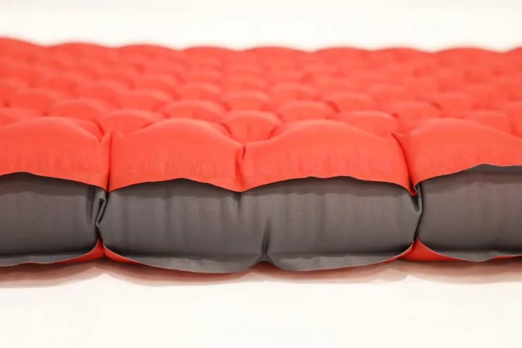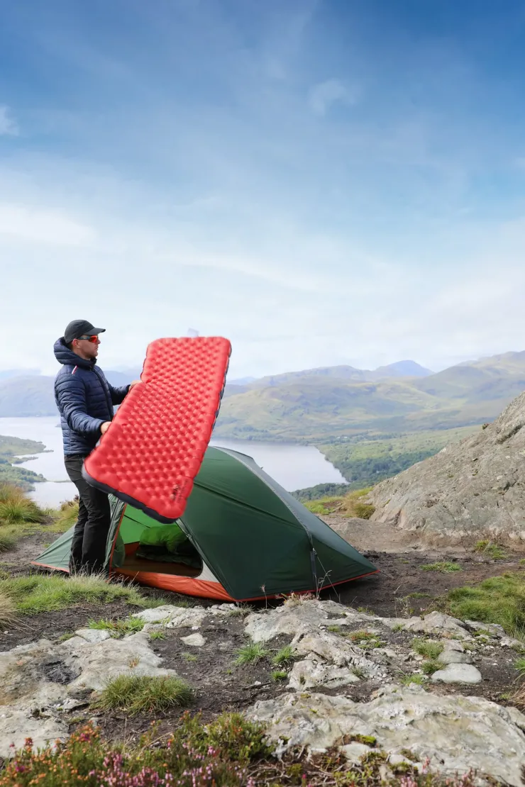 The unique vertical walled design produces a larger sleeping area than a traditional mat construction, whilst also maximising the heat retaining properties. By using aluminium, Thermal Reverb technology, combined with layers of strategically placed film, helps reflect heat back towards your body to keep you warm. The 20D top and bottom fabric are made from recycled nylon with a TPU lamination that is lighter, more compressible, and more environmentally friendly than traditional PVC constructions. This results in a smaller pack size without compromising on comfort. The Silent Sleep technology also ensures a peaceful night’s sleep by eliminating rustling or crinkling noise when moving. The air-filled welded channel construction moulds to the contours of your body, whilst the Airlock Valve allows for totally custom firmness that keeps you off the ground and snoozing all night.