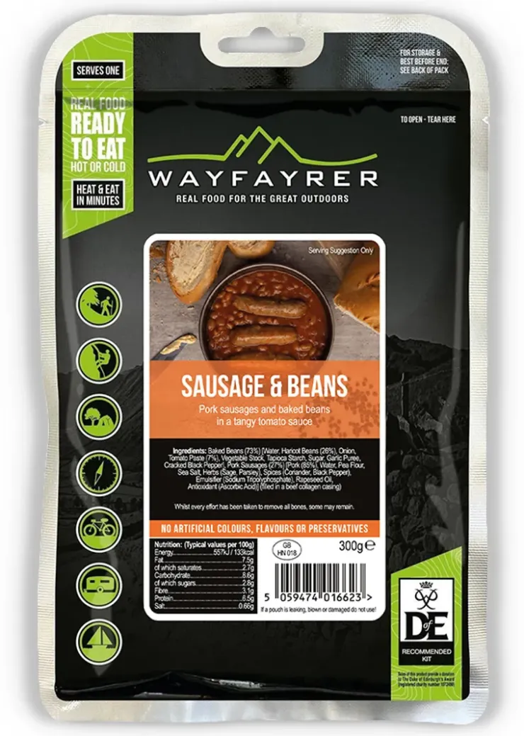 Like all Wayfayrer dishes, the Sausage and Baked Beans is produced using 100% real food ingredients, allowing the meal to be eaten hot or cold. It also contains a good balance of carbohydrates and proteins to keep energy levels high for hours, perfect when having an energetic day on the hills or when doing your favourite sport.